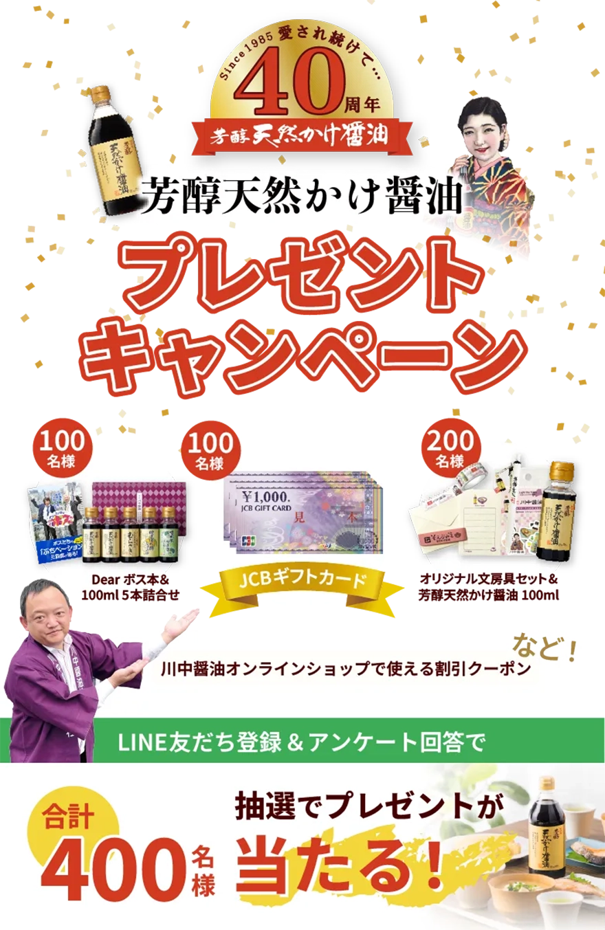 川中醤油オンラインショップで利用できる「400円割引クーポン券」を参加者全員に配布させていただきます。